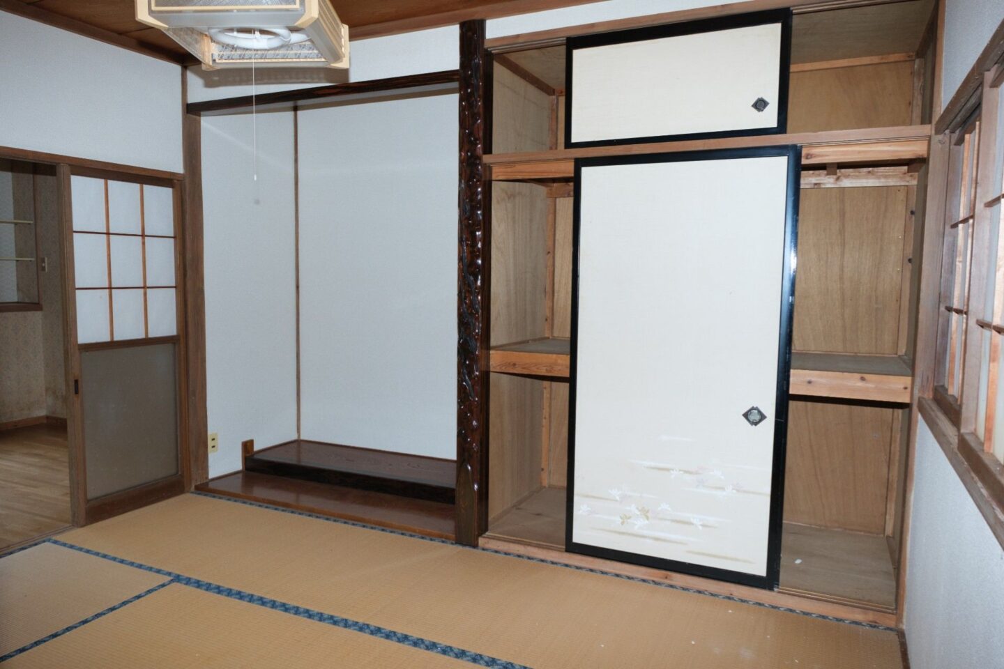さて、玄関前に立つと左手に自宅と一体となったガレージが付いている。玄関を入ると、昭和の雰囲気が漂う。多目的室という設定の部屋が1階と2階にあり、おそらく家事や洗濯に活躍してくれそうな配置になっている。360度ビューでご覧いただきたい。立地が、道の一番奥なので騒音などはあまり気にしなくてよいことだろう。