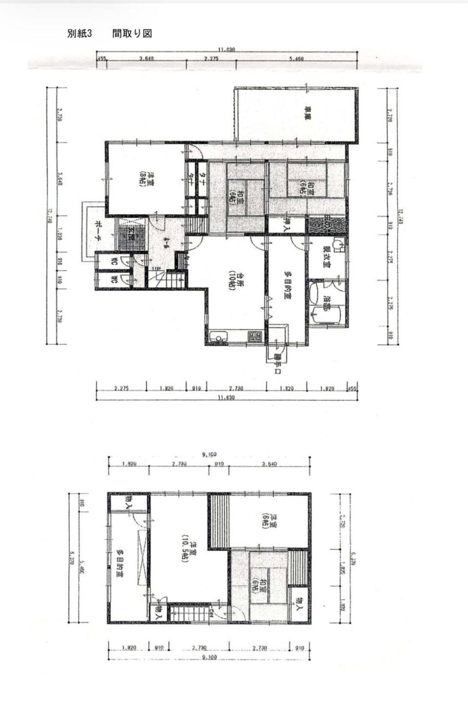 1階:居間(8畳)・台所(10畳)・風呂(0.75坪)・トイレ(0.75坪)・洗面台(0.75坪)・洋室(10畳1部屋・6畳1部屋)・和室(6畳)、2階:和室(8畳1部屋・6畳2部屋)